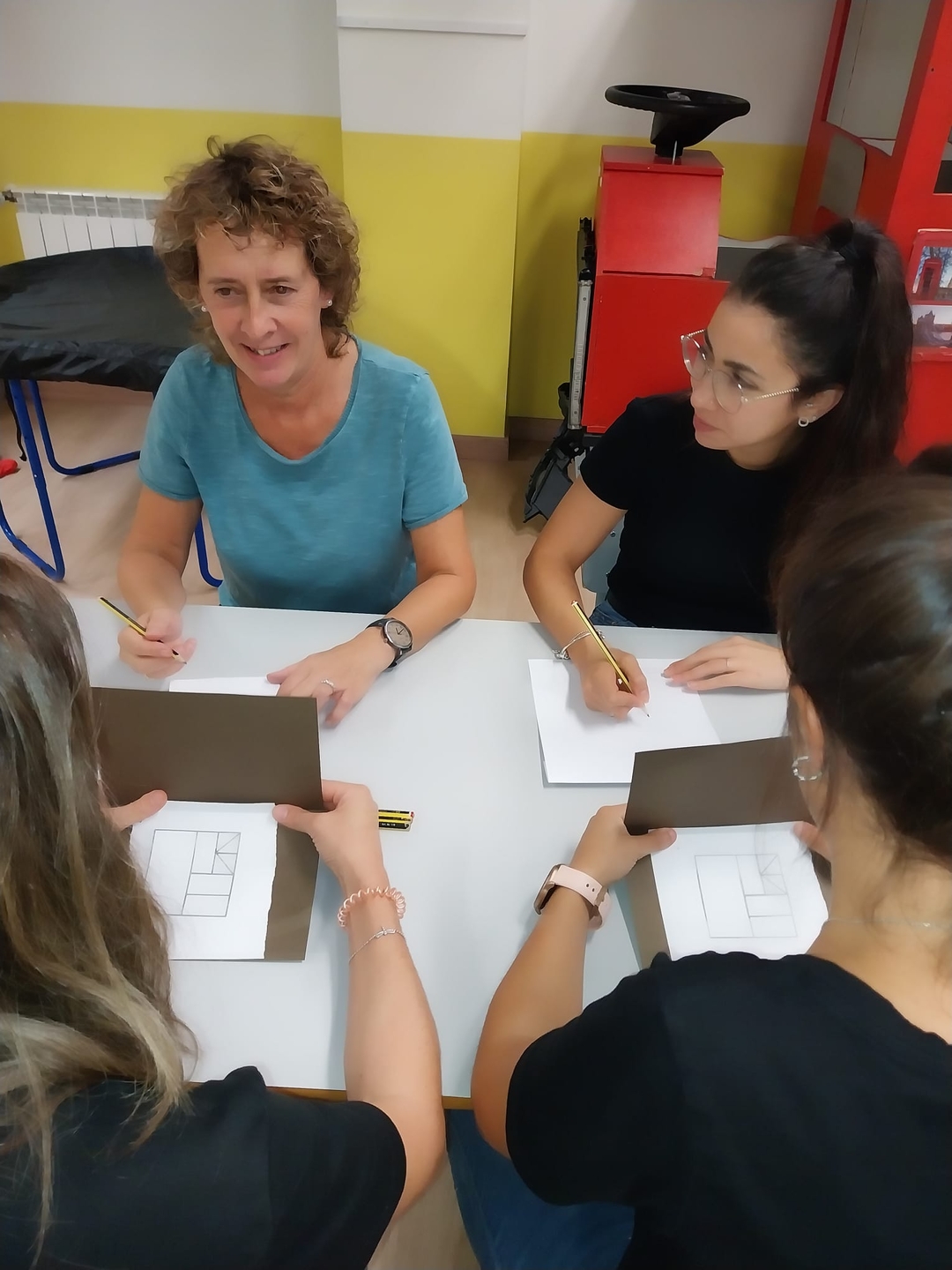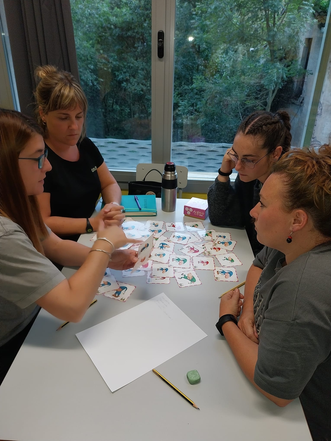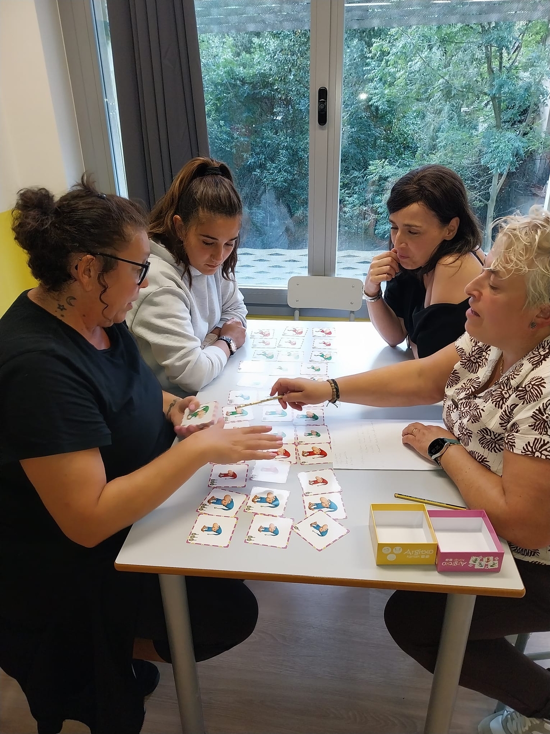 Irudi hauetan, Haur Hezkuntzako irakasleak ikusiko dituzue jolasak probatzen, ikastaro txiki batean. Behin jolasen funtzionamendua barneratuta, gure txikiekin lanean hasteko prest egongo dira!