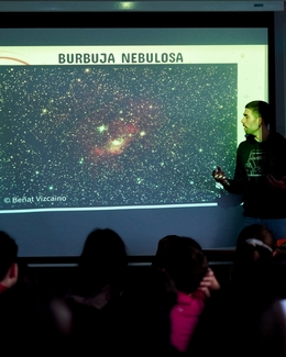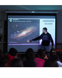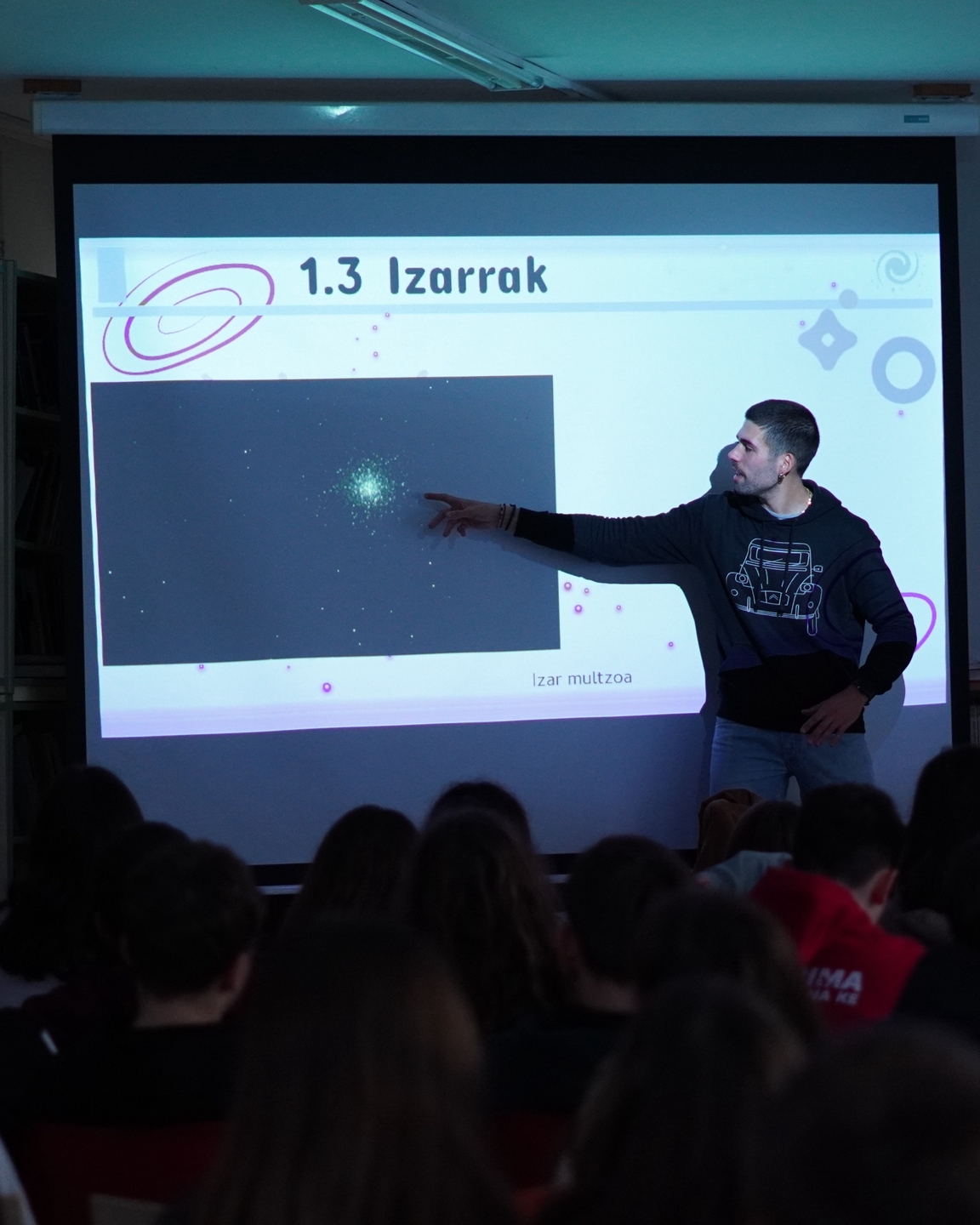 Ikasleek galdera mordoa egin dizkiote, unibertsoari buruzko kontuak ikasi, eta gainera, Beñatek berak ateratako espazioko argazki ikusgarriak ikusi dituzte.