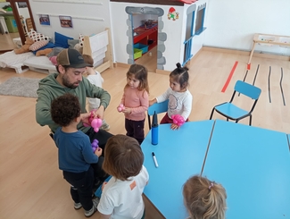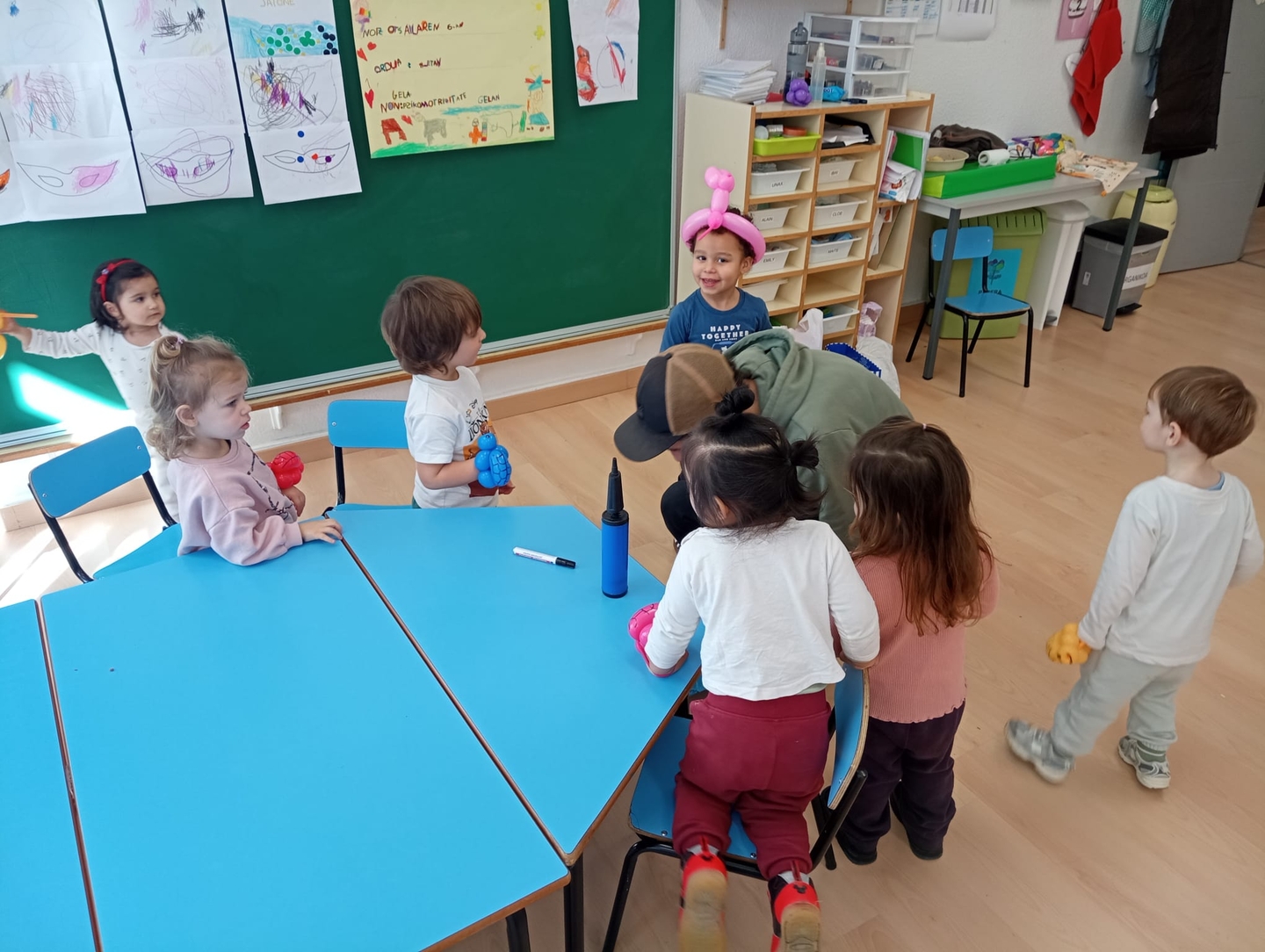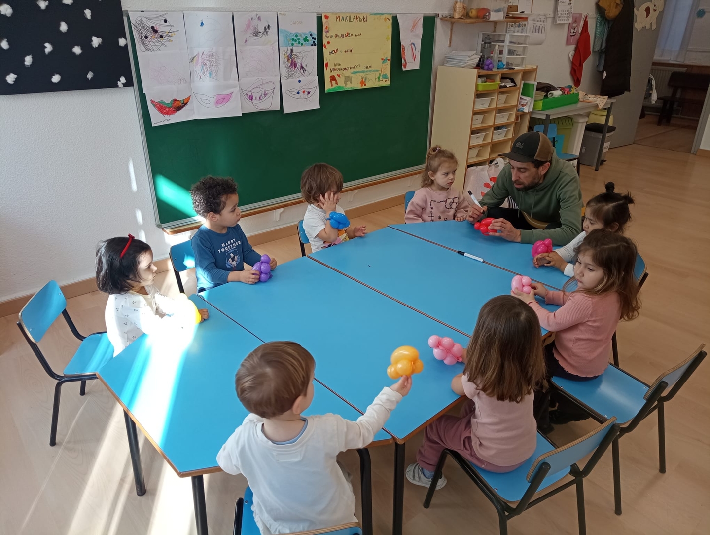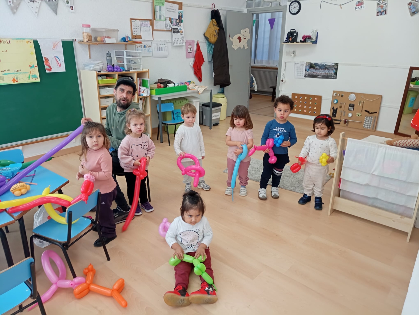 Saio hauetan gurasoek ekimen desberdinak proposatzen eta partekatzen dituzte ikasleekin, eta une bereziak sortzen dira. Oraingoan, guraso batek puxikekin forma desberdinak sortu zituen —dortokak, txakurrak edo ezpatak—, eta beste batek ipuin bat irakurri ondoren marrazkiak egiten aritu ziren elkarrekin.